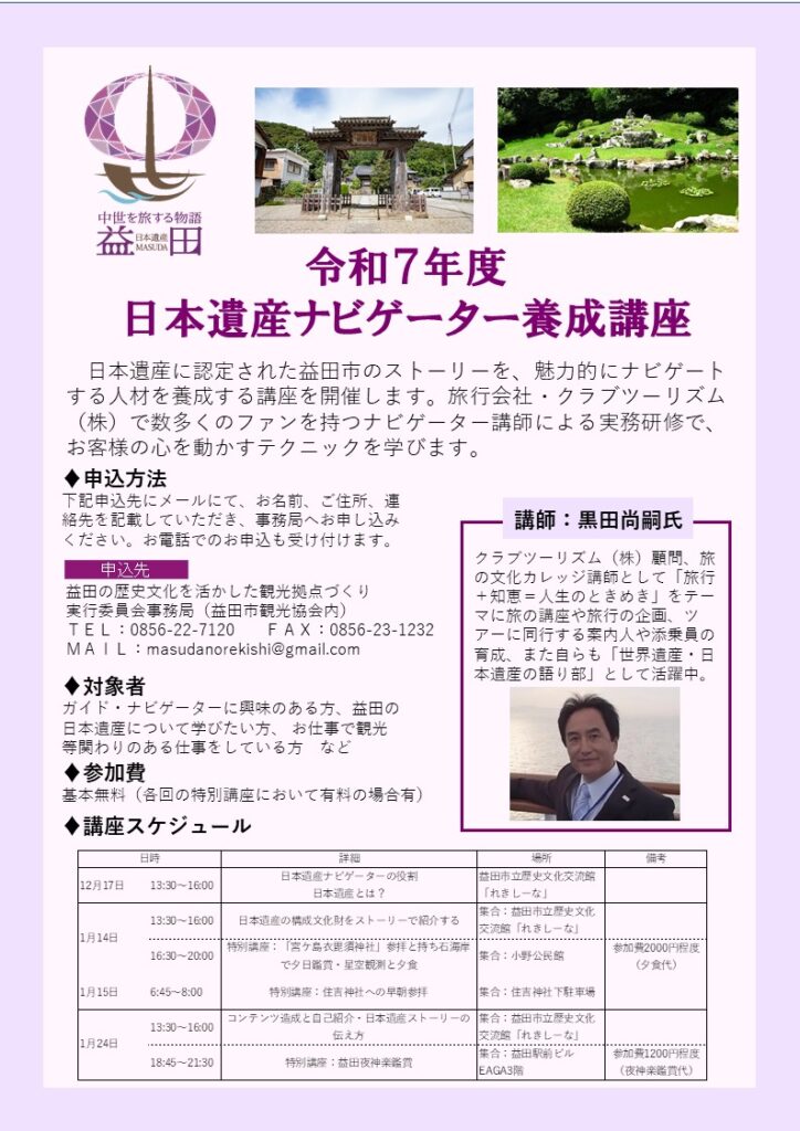 益田の歴史文化を活かした観光拠点づくり実行委員会では、日本遺産に認定された益田市のストーリーを、魅力的にナビゲートする人材を養成する講座を開催します。